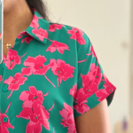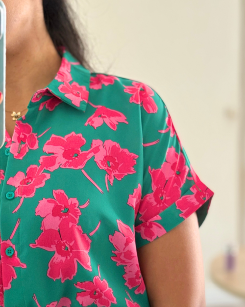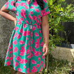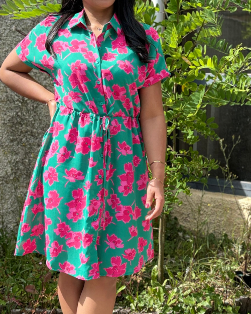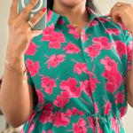Petite robe verte ornée de motifs floraux roses, manches courtes et boutonnage sur le devant. une ceinture fine intégrée souligne délicatement la taille pour une silhouette ajustée et légère.