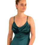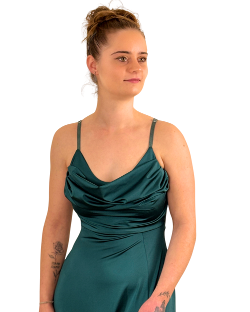 Robe de soirée longue à bretelles. Avec sa sublime couleur en vert canard, elle est parfaite pour les cocktails et événements élégants. Cette robe allie confort et allure raffinée.