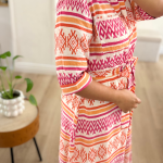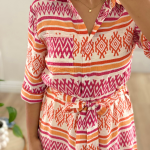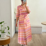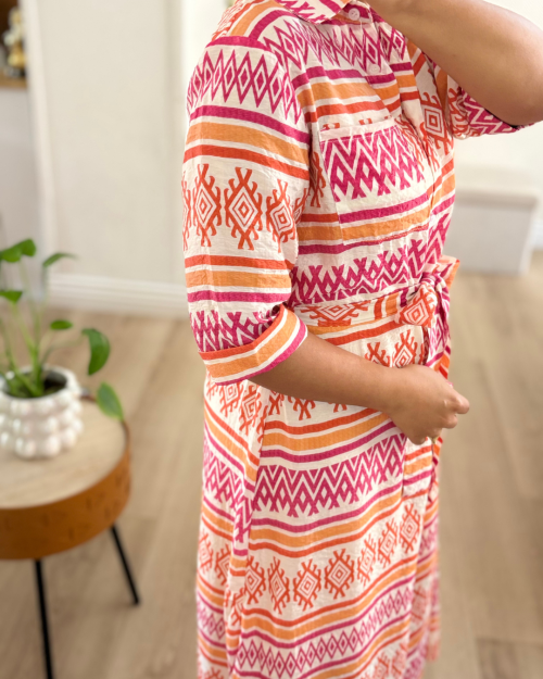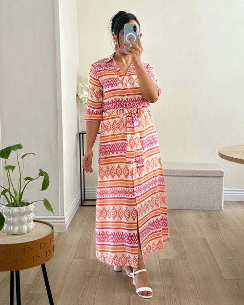 Robe chemise longue à imprimé géométrique bleu et blanc. Elégante et confortable, cette robe est dotée d’une ceinture à nouer qui met en valeur la taille et de manches 3/4.